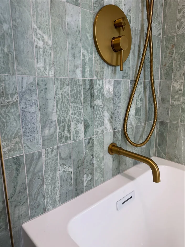 Upgraded all taps, shower heads, and controls to warm brass finishes, bringing a luxurious contrast to the cool-toned tiles. -