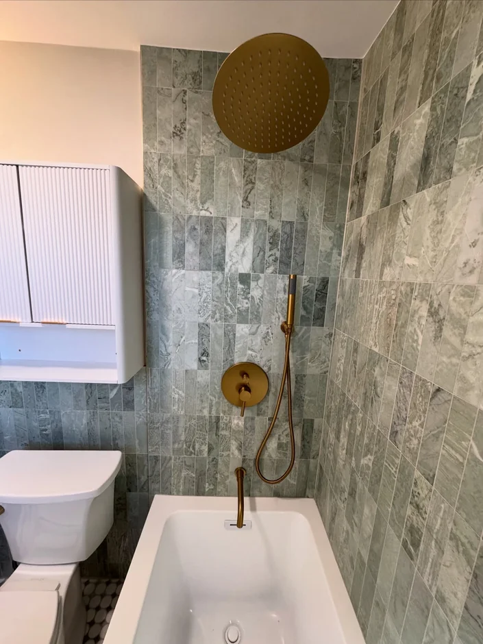 This bathroom renovation brings a fresh, modern look with soft green tiles, warm brass fixtures, and clean white surfaces. The redesigned space feels brighter, more elegant, and thoughtfully updated for everyday comfort.
