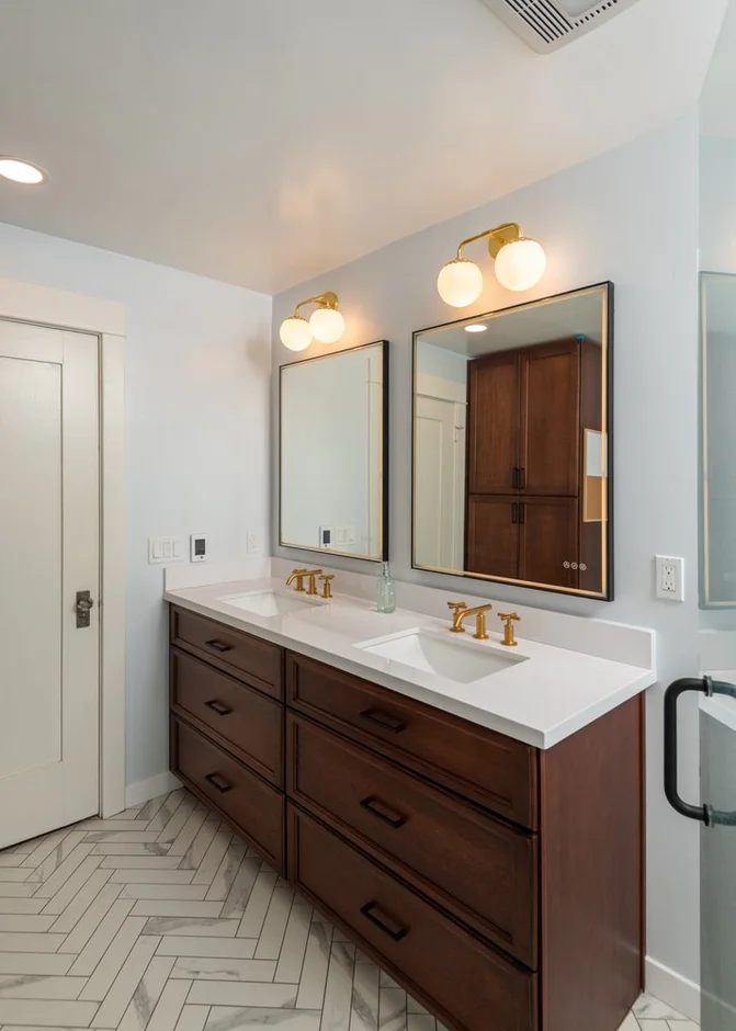 Electrical systems were updated, and new wall-mounted vanity lights were installed above each mirror to provide balanced, functional illumination. Additional ceiling lighting ensures even brightness throughout the space.