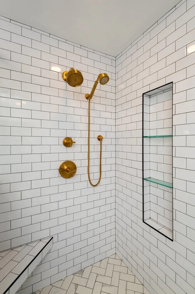 The shower was fully rebuilt and retiled using classic white subway tile installed in a clean, uniform pattern. Built-in recessed glass shelves were added for convenient storage. The shower floor features coordinating tile installed with proper slope toward a new linear-style drain to ensure efficient water flow.