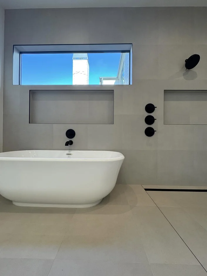 Positioned a sculptural freestanding tub against a full-height tiled wall with a horizontal picture window, offering natural light and elevating the space to resort-level comfort. -