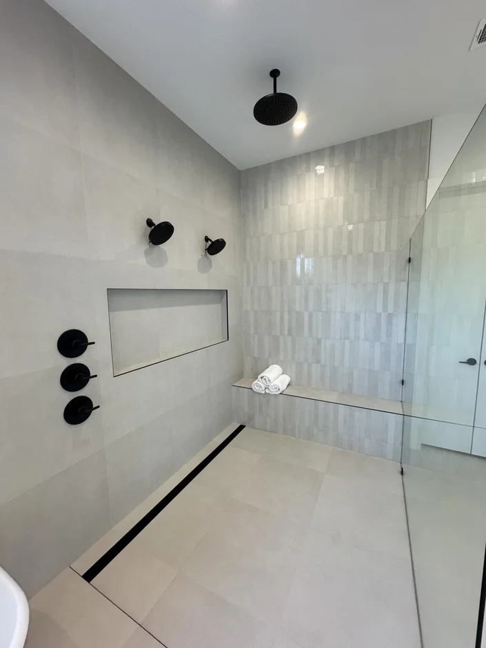 Built a spacious, curbless walk-in shower with large-format tiles and a sleek linear drain, creating a seamless floor transition and a minimalist, high-end appearance. The shower includes dual matte-black shower heads and a built-in bench for added comfort. -