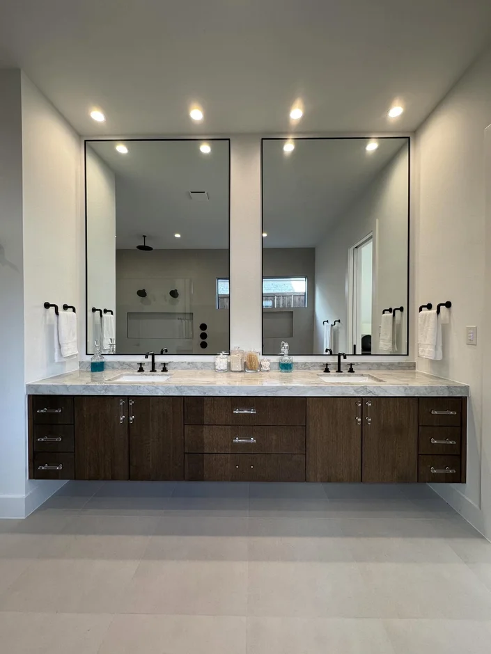 Installed a custom floating vanity with rich wood cabinetry and polished hardware, paired with a marble-look countertop and dual undermount sinks. This setup enhances visual lightness and maximizes floor space. -