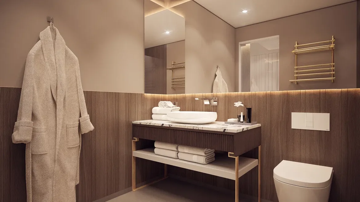 The updated bathroom now feels open, organized, and visually calm. Warm textures soften the modern lines, while improved lighting and storage make the space far more functional for daily apartment living.