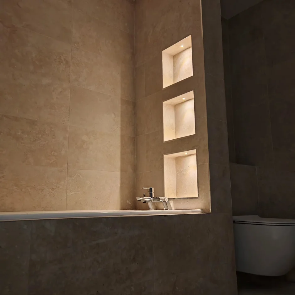Applied large-format beige stone-effect tiles on walls and floors to create visual continuity, durability, and a calm spa-like ambiance. -