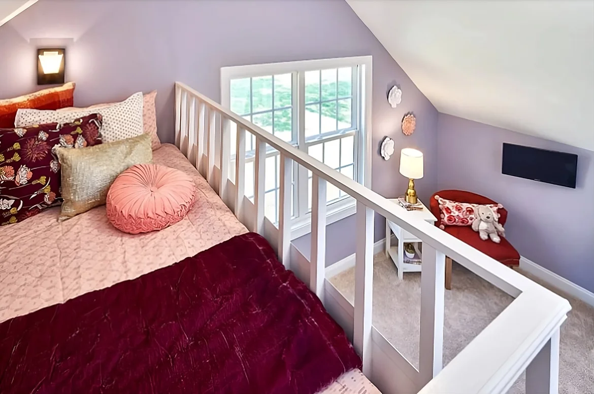 A small, underused attic space was transformed into a dreamy, functional bedroom for a little girl, complete with a custom bunk bed, clever storage, and soft pastel colors that spark imagination.