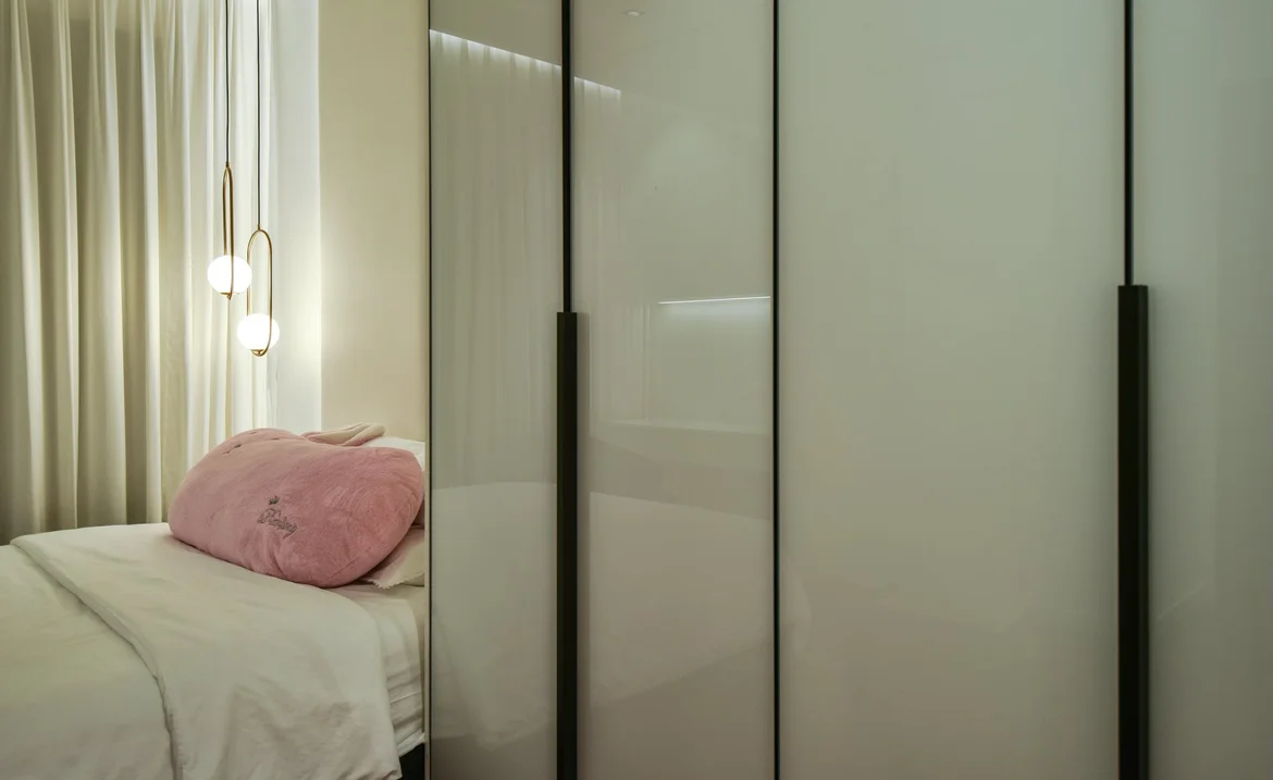 A custom floor-to-ceiling built-in wardrobe with sliding doors was installed. The unit was precisely fitted to the room geometry, with clean vertical alignment and flush integration against finished walls and ceiling.