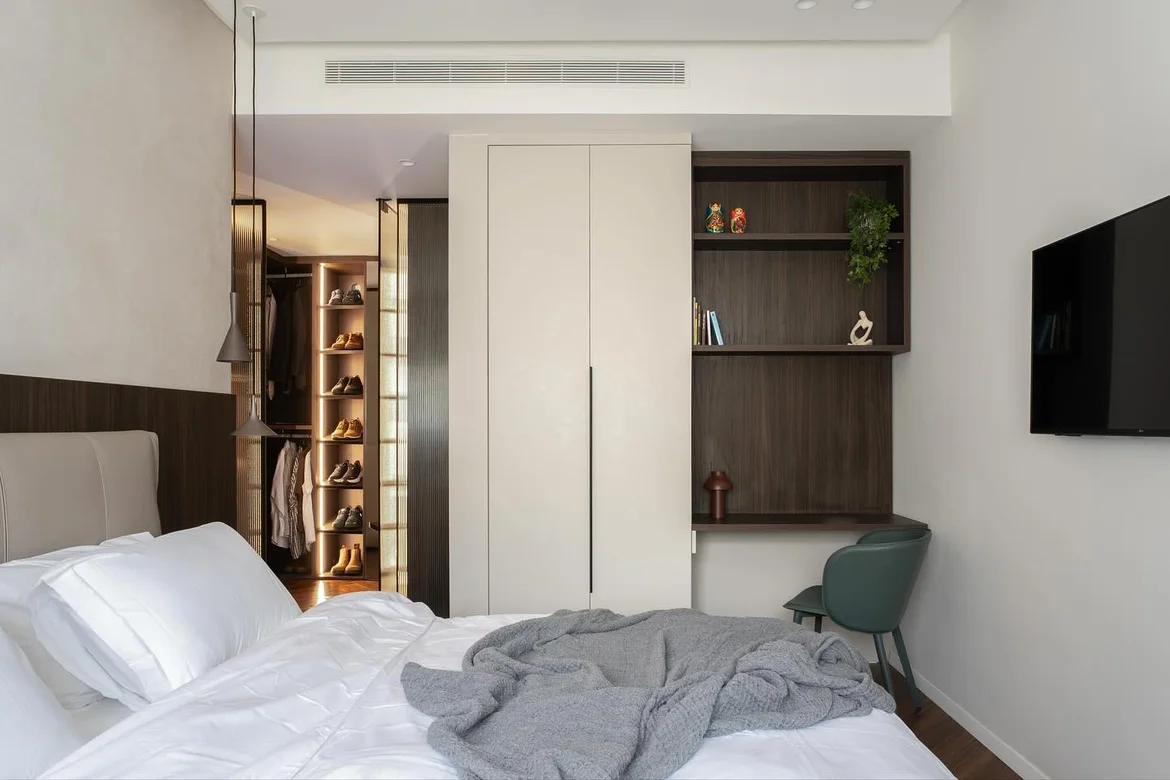 Integrated a minimalist wardrobe with seamless doors and a compact workspace featuring dark wood shelving for added practicality and visual harmony. -