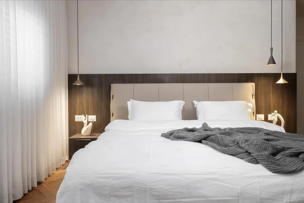 Installed a smooth, light-toned textured wall finish behind the headboard to add depth and a soft, elegant backdrop without overwhelming the room. -