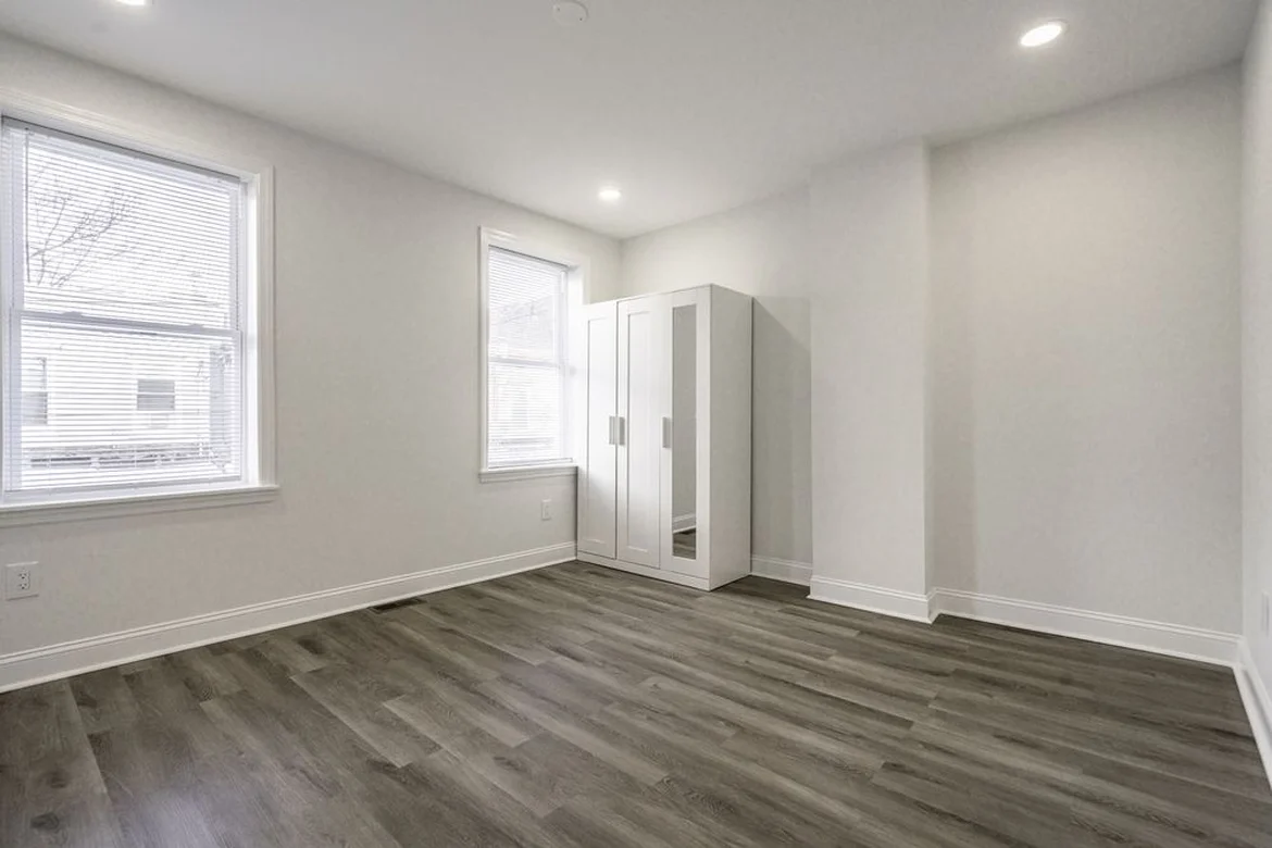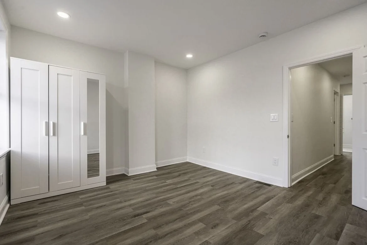 Interior doors, baseboards, and trim were upgraded with modern white finishes, giving the room a polished and finished appearance.