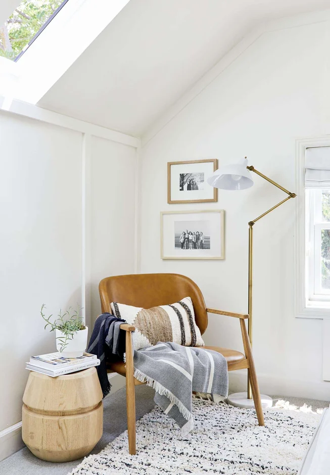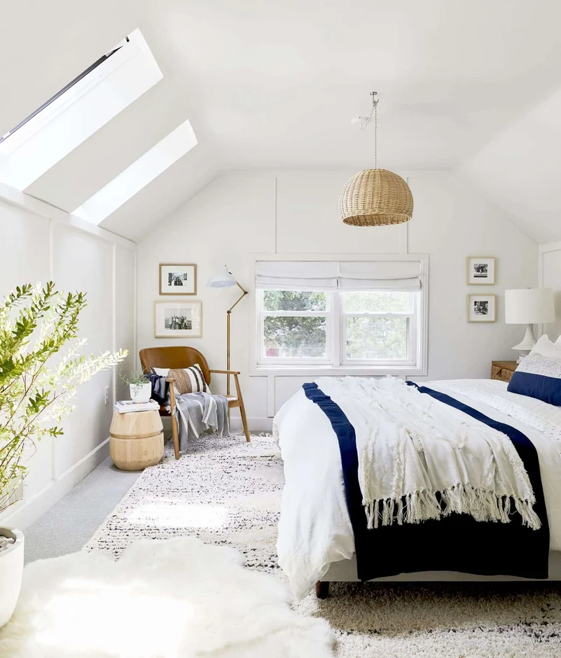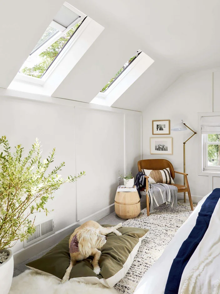 What once felt like a dim attic has become a luxurious light-filled bedroom perfect for rest, reading, and relaxation.