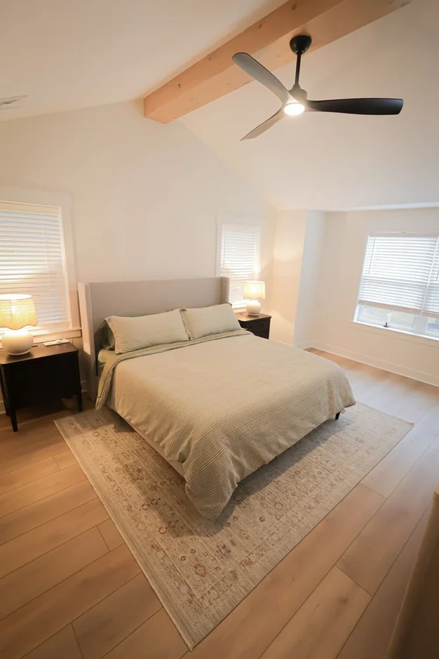 The ceiling was reworked to highlight the vaulted design, and the existing wood beam was exposed, refinished, and sealed. Vent openings were adjusted to improve airflow and meet code requirements.