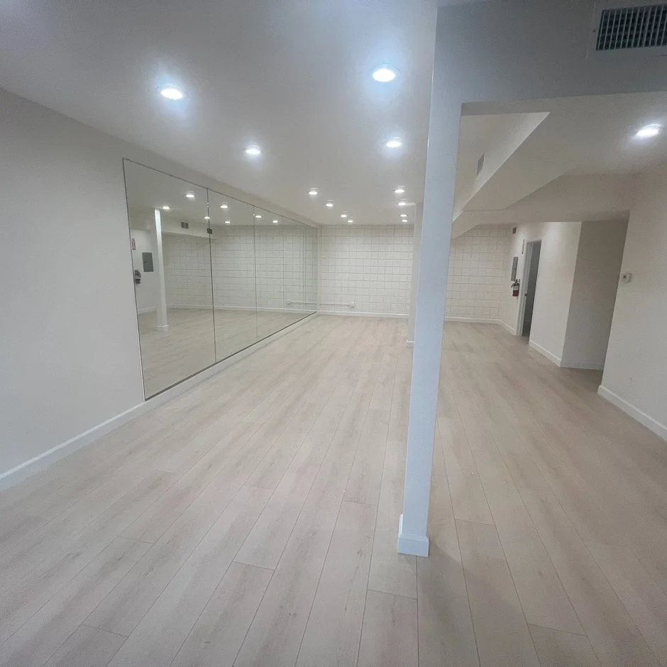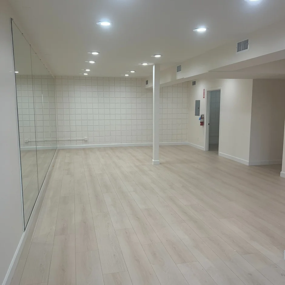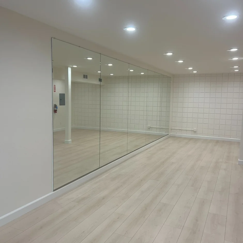Installed a large, floor-to-ceiling mirror wall to visually expand the space and support functional uses such as training, fitness, or studio activities. -