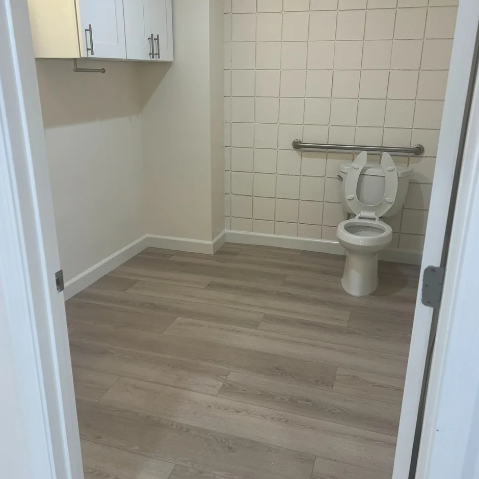 Completed a commercial restroom with a toilet, grab bar, durable flooring, and tiled accent wall, designed to meet accessibility and practical use requirements. -