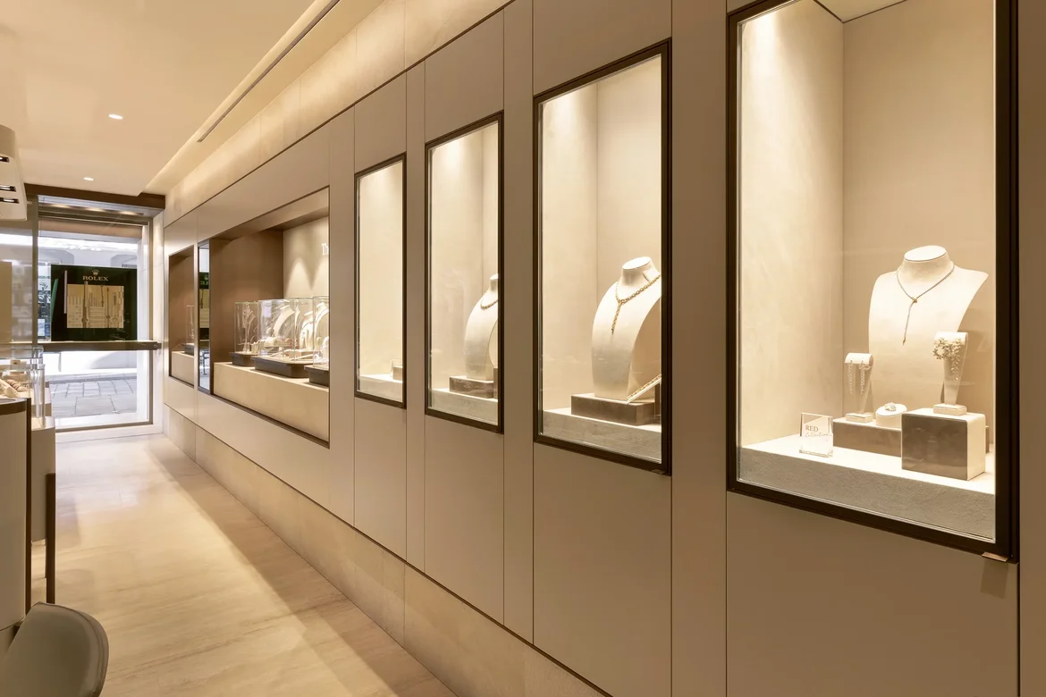 The renovated boutique now feels open, balanced, and distinctly modern. Jewelry pieces are clearly presented and visually prioritized, while the space itself communicates quality and sophistication. The result is a calm, luxurious retail environment designed to support both browsing and personal consultations.