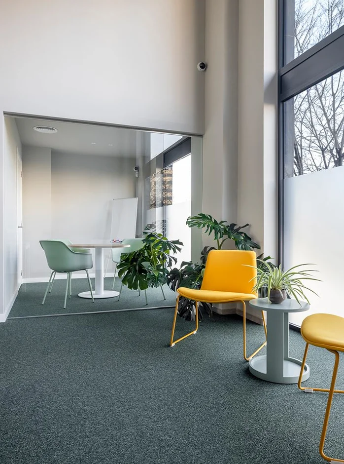 Installed modern carpet flooring in muted green tones to improve acoustics and comfort underfoot.
