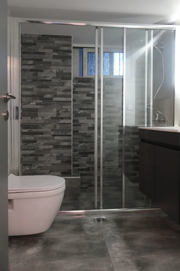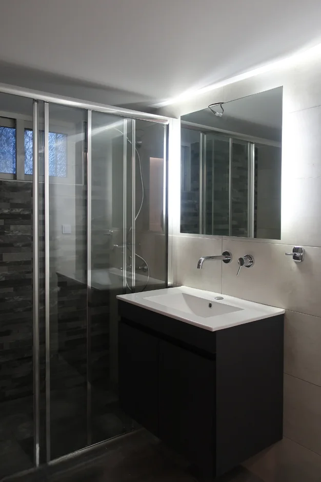 Fully renovated the bathroom with large-format tiles, a glass-enclosed shower, wall-mounted toilet, modern vanity with integrated basin, and a large mirror with LED lighting. Finishes were selected to be water-resistant, low-maintenance, and visually consistent with the overall design language. -