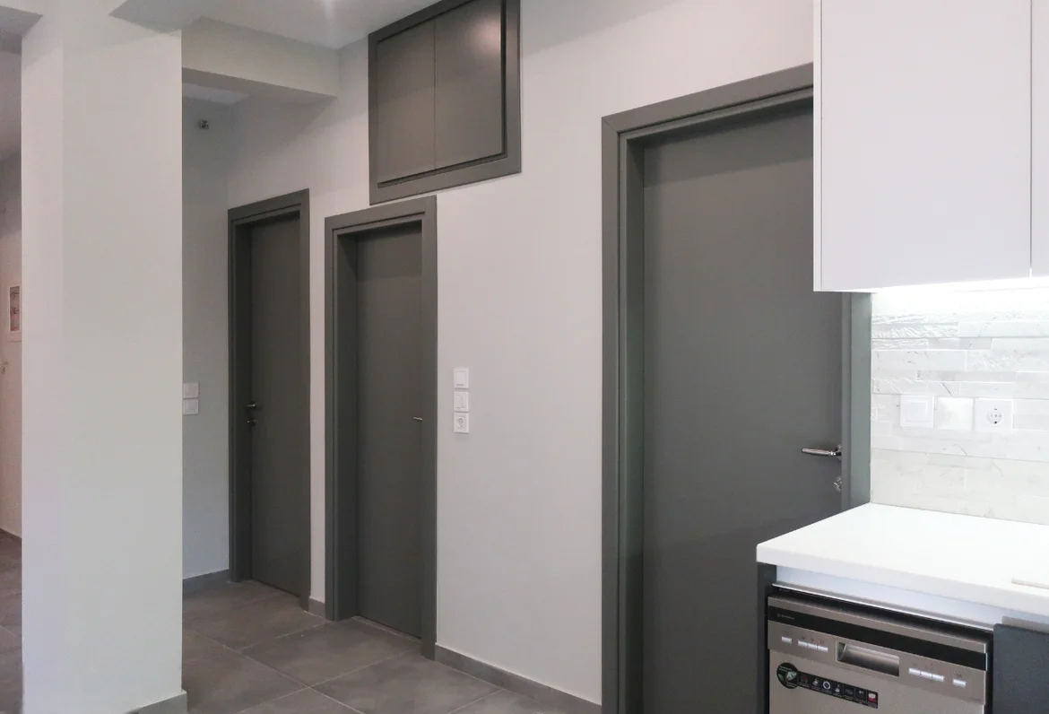 Installed modern interior doors in a dark-grey tone, aligned frames and hardware, and completed final trimming and detailing to ensure a uniform, professional finish throughout.