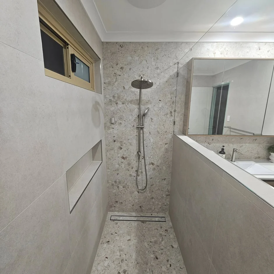 Installed a spacious walk-in shower with a frameless glass panel, linear drain, and a built-in shower niche for a clean, open feel. -