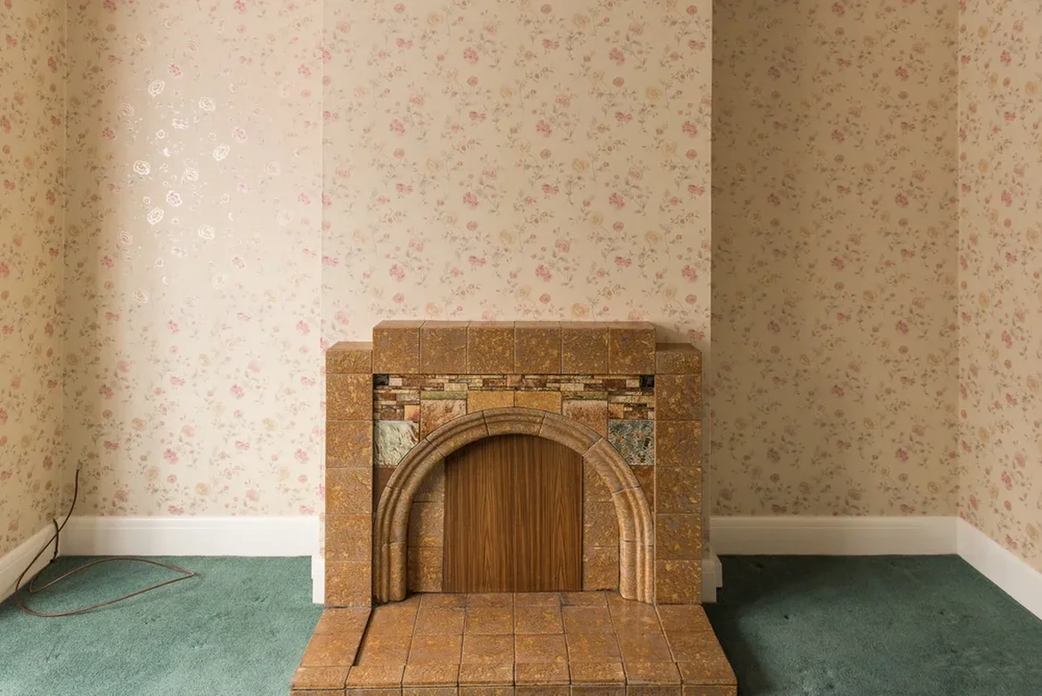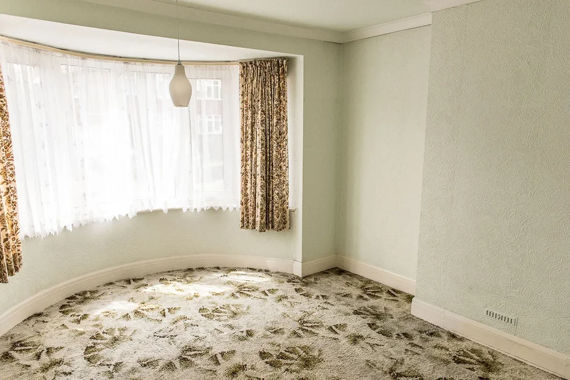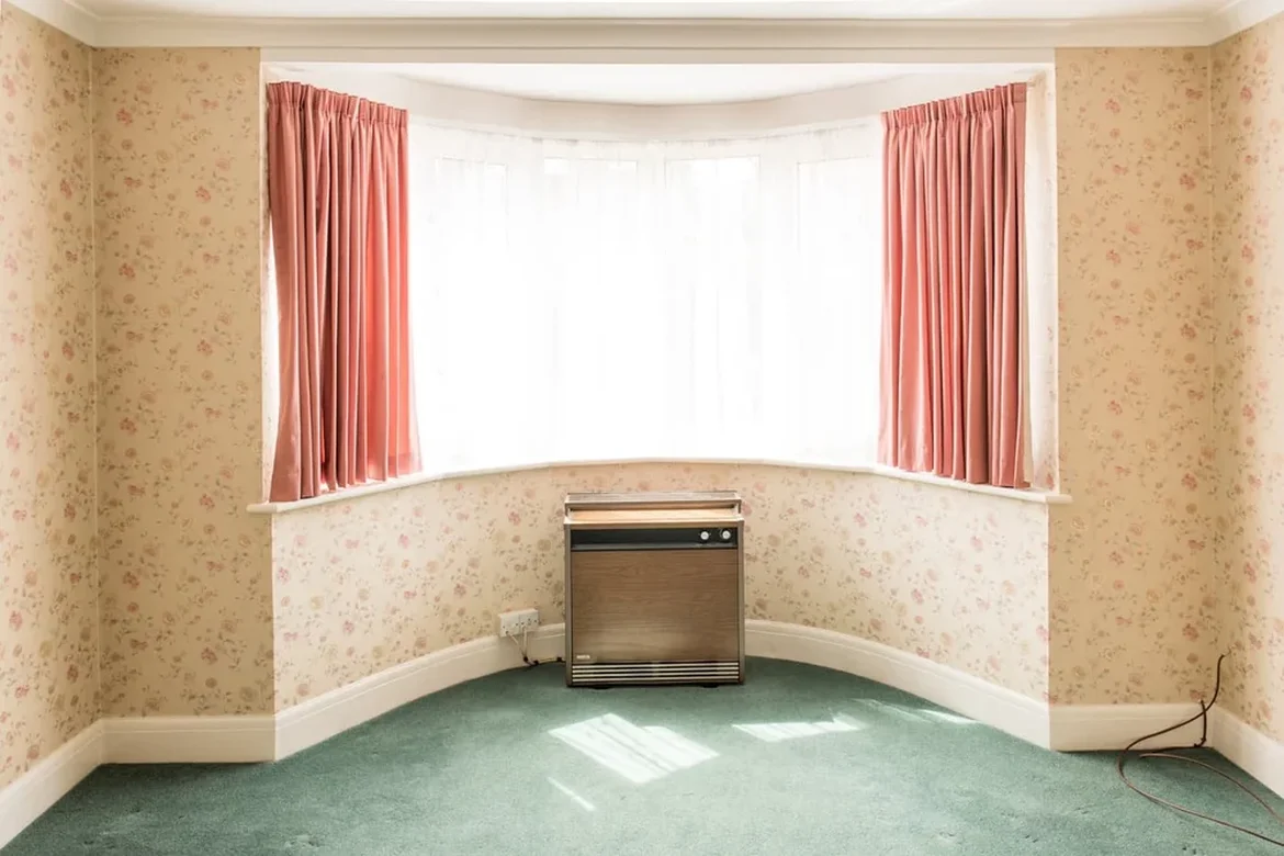 Removed outdated wallpaper, curtains, and carpets.
