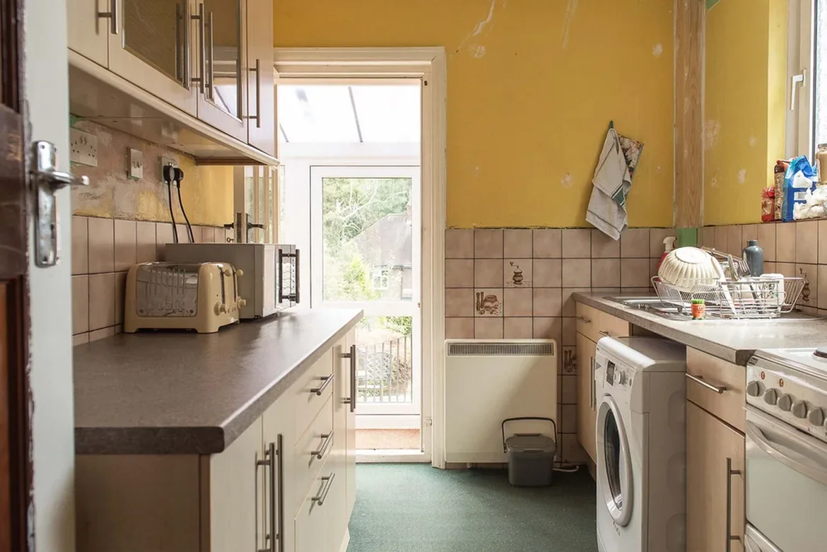Stripped outdated cabinetry and repaired damaged walls.