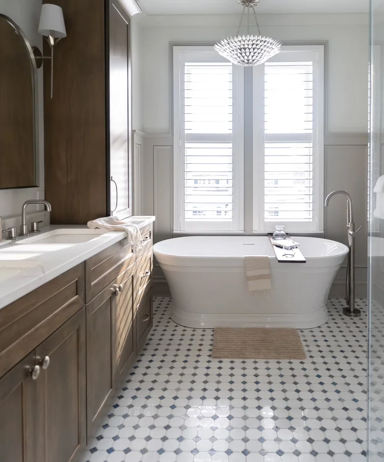 Laid patterned floor tiles to add subtle visual interest while maintaining a neutral, classic look suitable for daily use. -