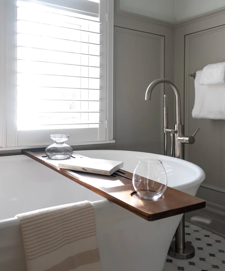 Added a brushed metal floor-mounted tub faucet with a handheld option, providing reliable functionality and a clean, modern appearance. -