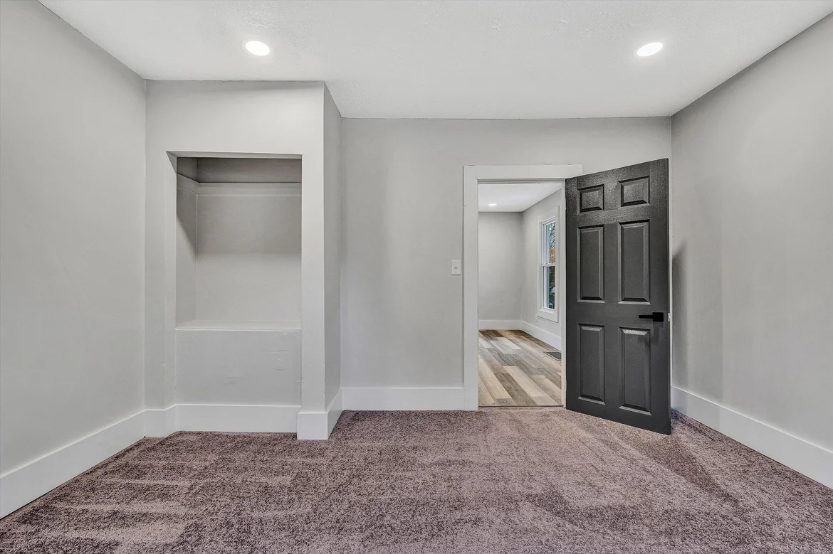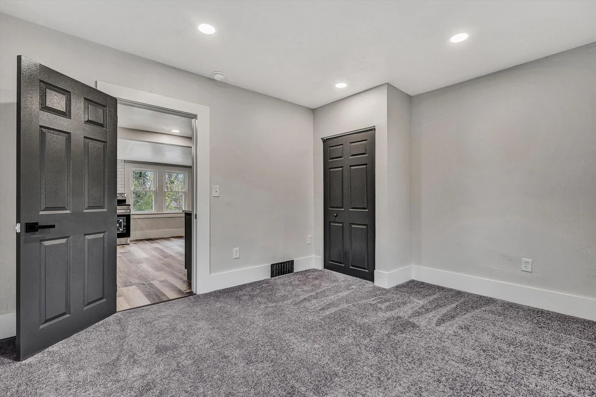 New interior doors were installed and finished in a bold dark color to create visual contrast. Updated baseboards and door trim were added throughout the home, giving the space a polished and finished look.