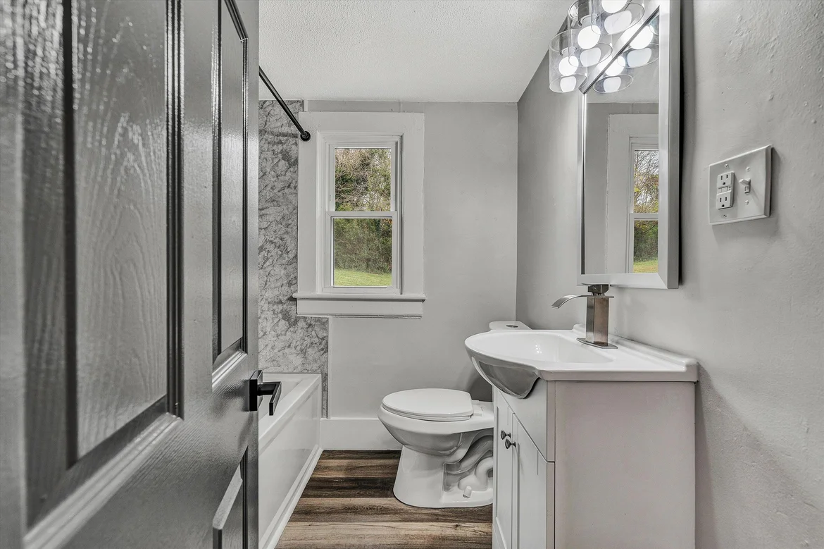 The bathroom was fully refreshed with a new vanity and integrated sink, updated plumbing fixtures, and a modern faucet. The tub surround was upgraded with marble-look wall panels, providing a clean, elegant finish that is easy to maintain.