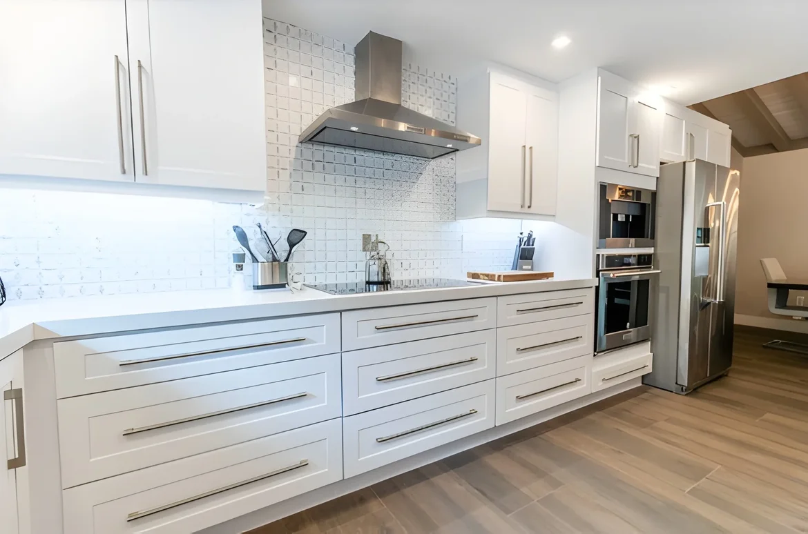 Finishes: Added a hexagonal tile backsplash, stainless steel appliances, and sleek pendant lighting over the island.