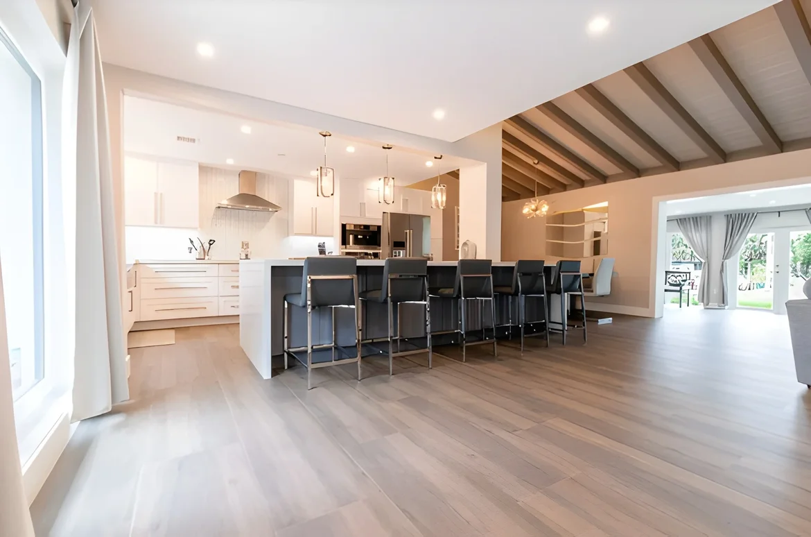 Wall Removal: Demolished non-load-bearing walls to create a cohesive open-concept flow between the living, dining, and kitchen areas.