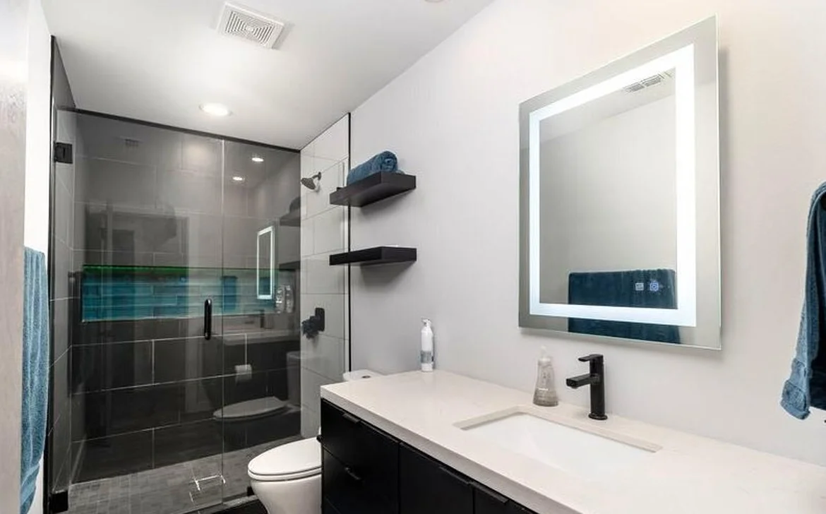 Primary bathroom: Spa-like serenity with frameless glass showers, LED backlit mirrors, floating vanities, matte black fixtures, and bold tile contrasts.
