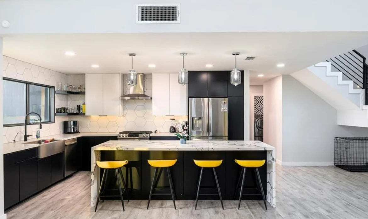 Clean lines, high ceilings, black and white cabinetry, luxurious marble-look quartz counters, and industrial-chic accents define the interior. The exterior received a dramatic update with sharp geometric forms, black accents, and a striking yellow front door that adds personality while maintaining modern minimalism.