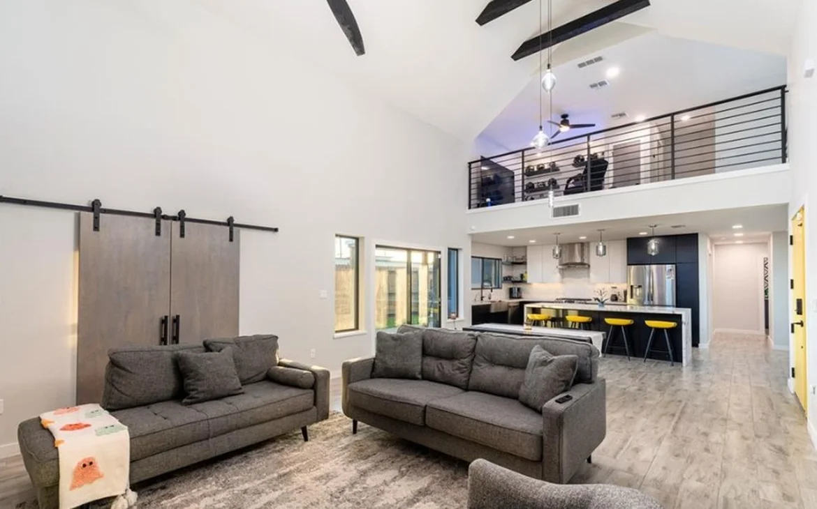Open-concept living: Vaulted ceilings, light wood-look flooring, gray sectional sofas, sliding barn doors, and abundant natural light from large windows.