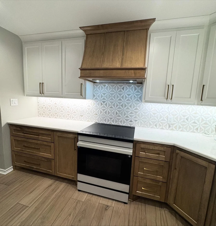 Applied a patterned tile backsplash that adds texture and subtle visual interest without overpowering the space. Precision installation and alignment ensure a refined, high-end finish. -