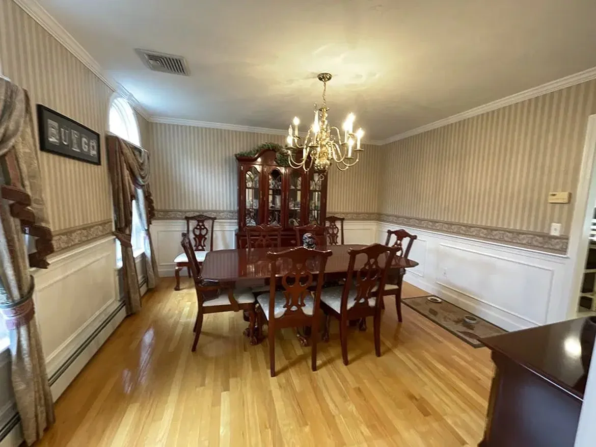 The original first floor featured a traditional, closed-off layout. The kitchen had dark islands and green walls, while the separate dining and living rooms were filled with dated, dark wood furniture and warm-toned decor, creating a less cohesive feel.