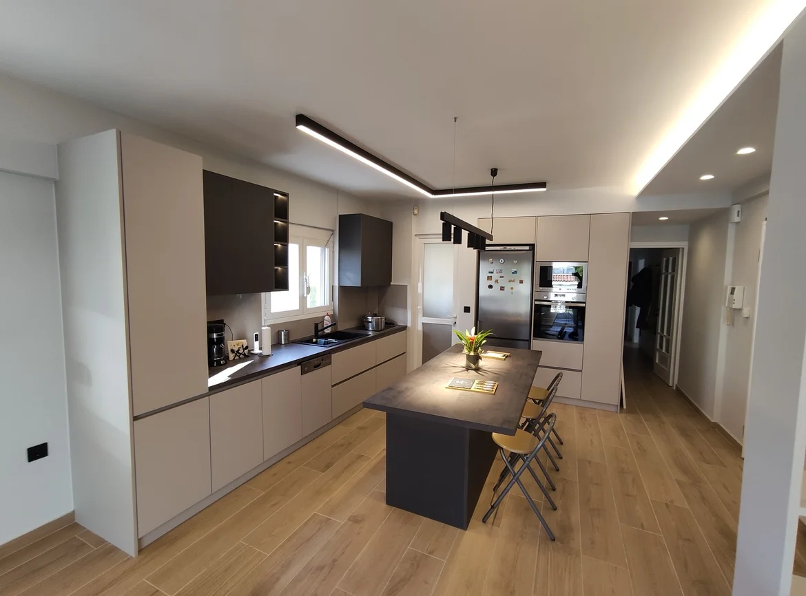 Designed and installed a custom kitchen with handle-less cabinetry, integrated appliances, and a large central island serving as both a workspace and casual dining area. -