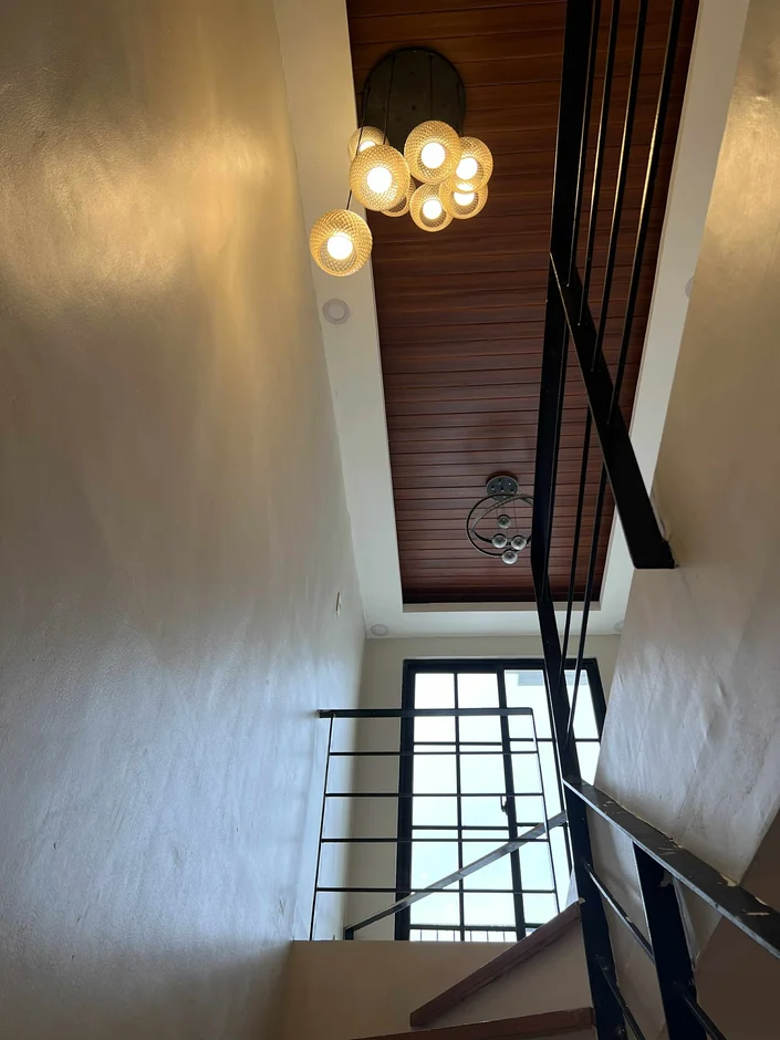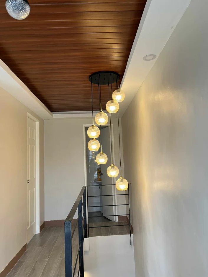 Installed a cluster of spherical pendant lights at varying heights to illuminate the corridor and stairway, enhancing the design while providing functional lighting. -