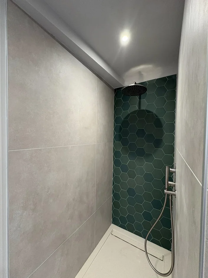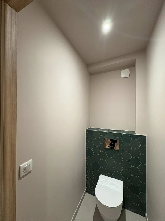 Reimagined the separate toilet area with the same green hexagonal tile accent for continuity. Installed a wall-hung WC and concealed-system flush plate for a sleek, uncluttered finish. -