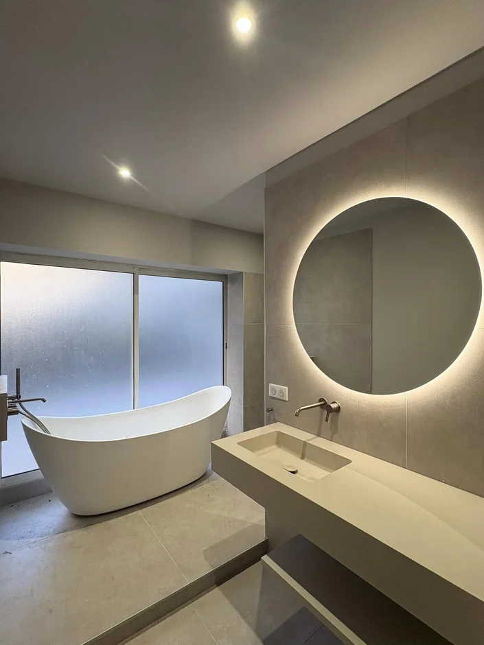 Installed a freestanding solid-surface bathtub placed against full-height frosted glazing for a soft, diffused natural light effect. A custom monolithic vanity with integrated basin and a large circular backlit mirror completes the serene contemporary look. -