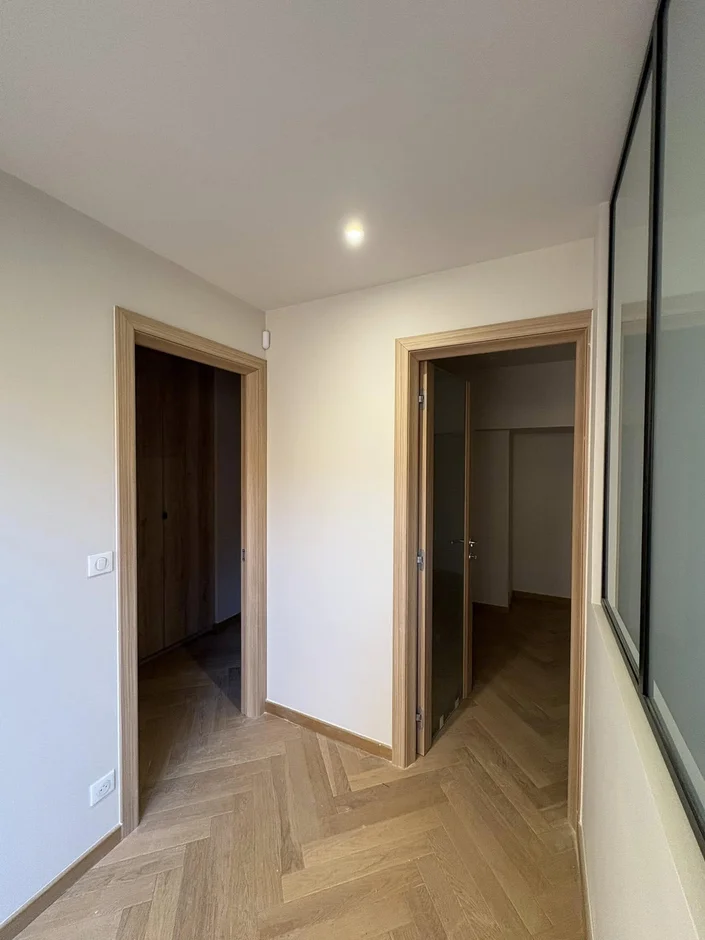 Added herringbone oak flooring across the living areas and bedrooms, introducing warmth and a sense of craftsmanship. The natural tone balances the apartment’s modern neutral palette. -