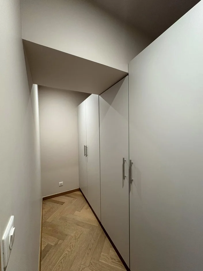 Installed full-height built-in wardrobes in multiple rooms, using a combination of soft grey and natural wood finishes. These maximize storage while blending seamlessly into the interior architecture. -