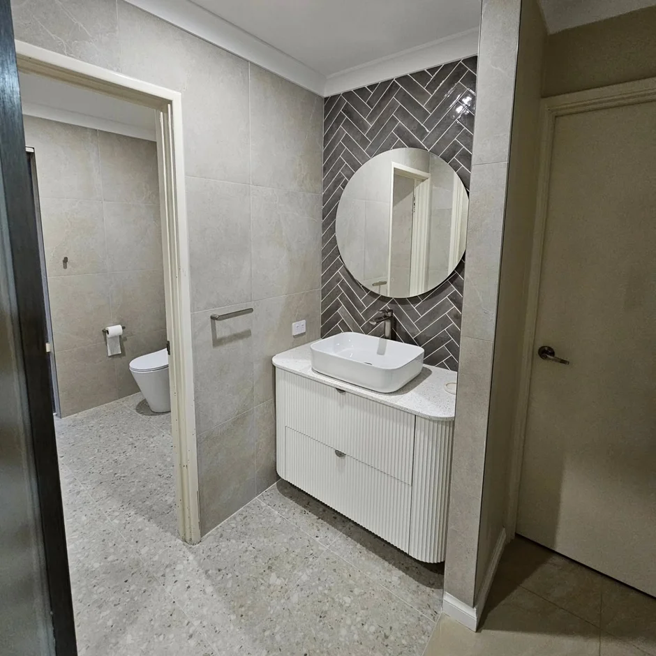 Added a custom vanity featuring fluted cabinetry, soft-close drawers, and a stone benchtop with a vessel basin, providing both storage and everyday practicality. -