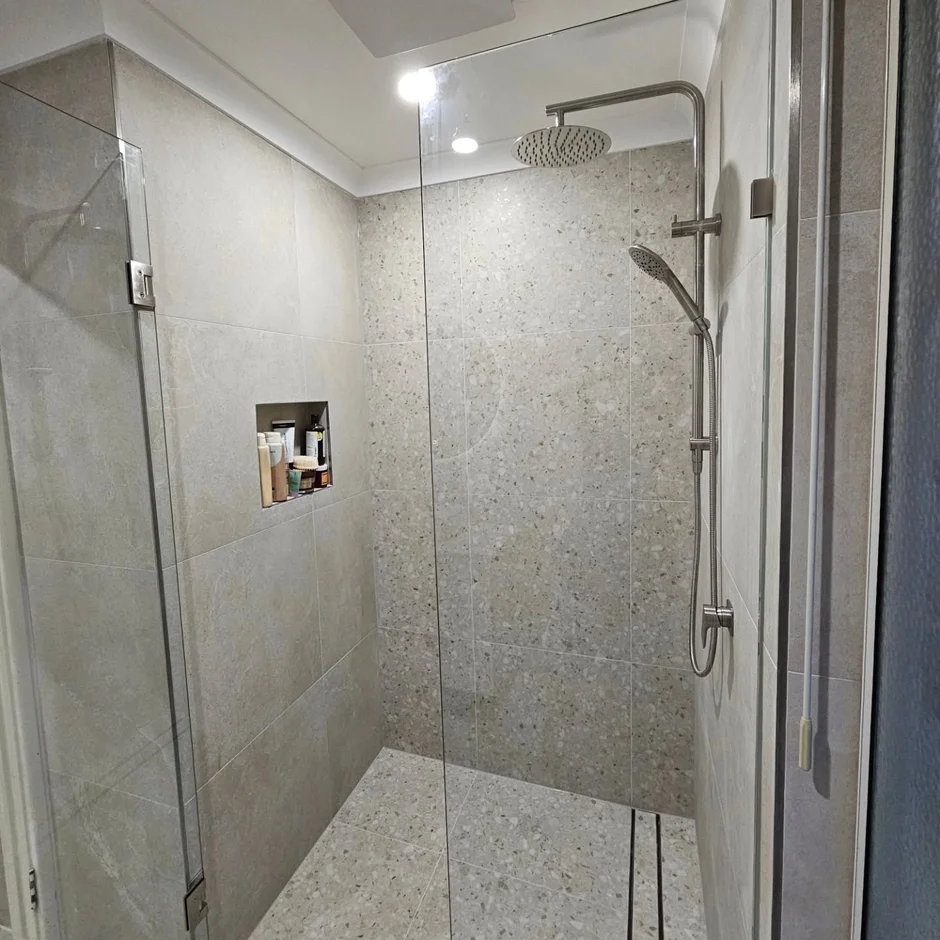 Built a walk-in shower with a frameless glass screen, tiled floor, and integrated wall niche for everyday storage. A rainfall shower head and handheld mixer were installed for practical daily use. -