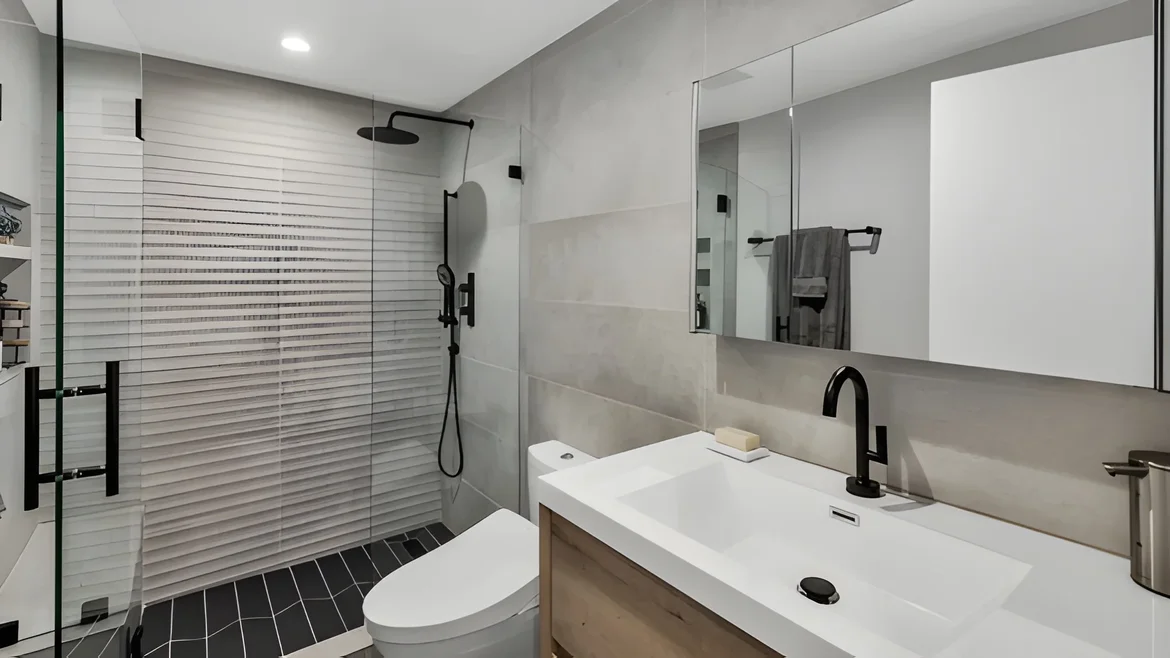 Designed a spa-like retreat with oversized porcelain tiles, frameless glass shower, modern matte black fixtures, and a floating vanity with wood accents for warmth and balance. -