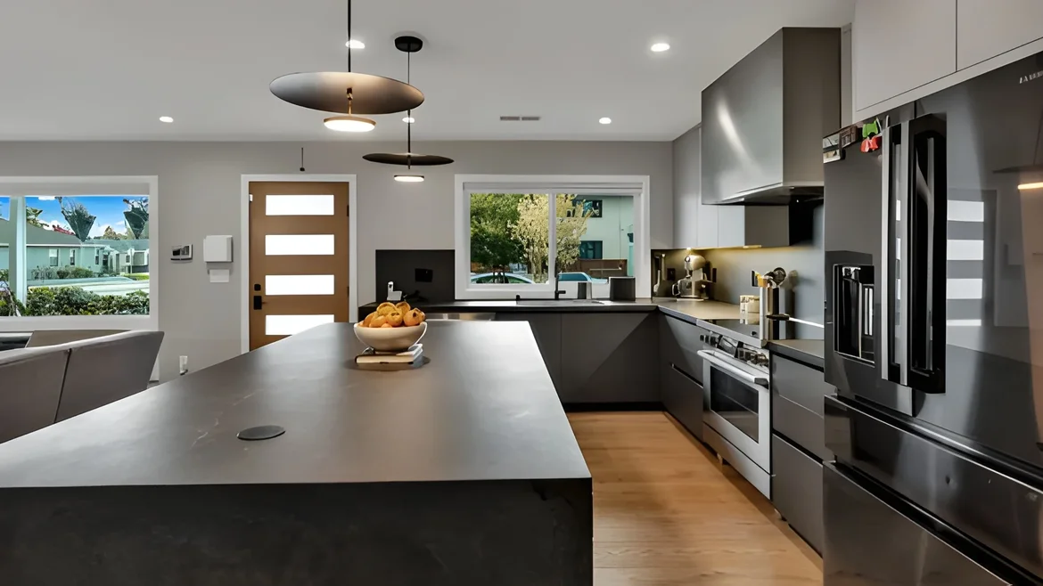 Installed a sleek, open-concept kitchen featuring a large stone island with integrated appliances, matte black fixtures, and custom cabinetry. The layout now encourages connection between the cooking, dining, and living spaces. -