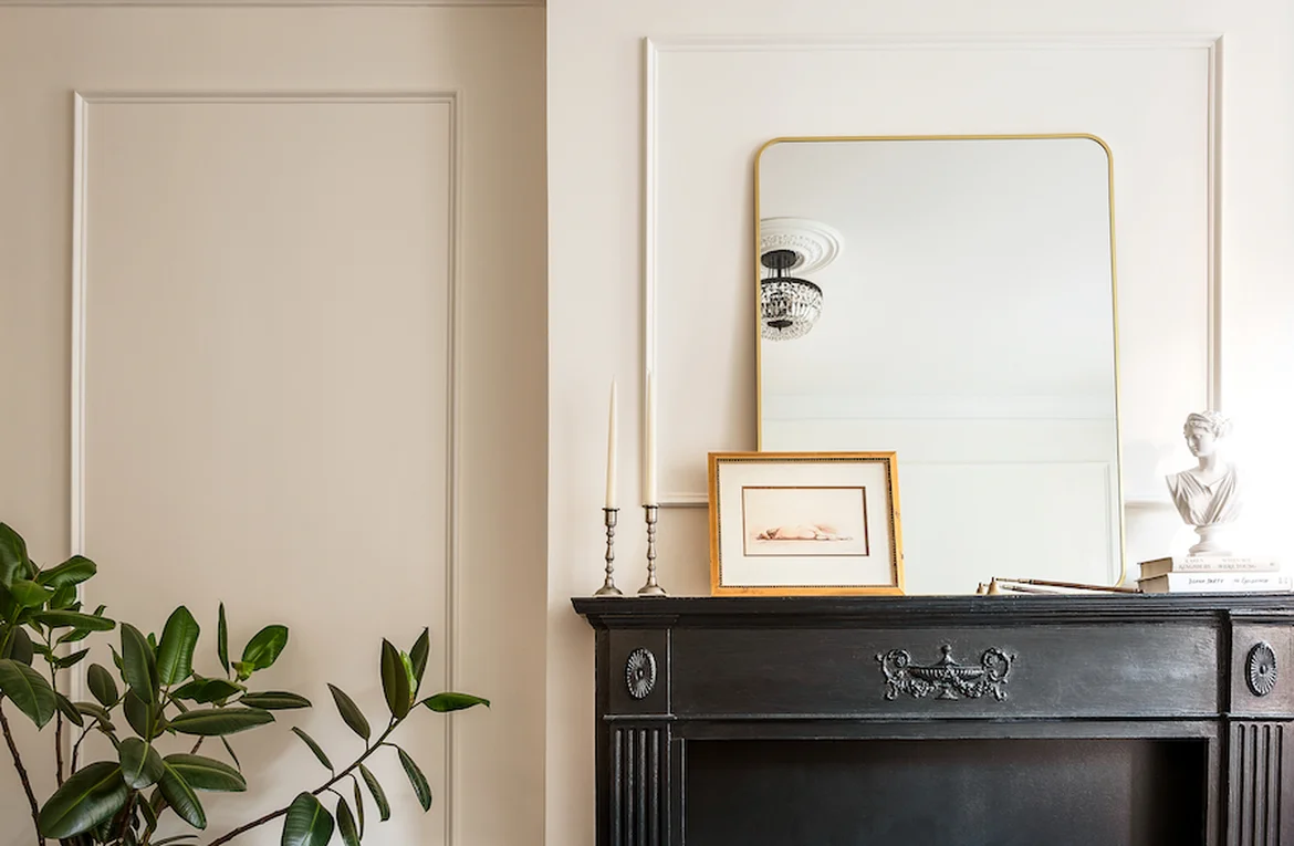 The mantel and surrounding shelves were styled with a curated mix of art, candles, and decorative objects.