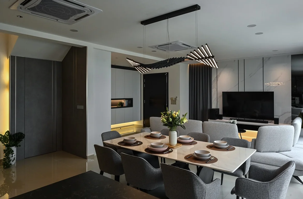 The electrical system was upgraded to support a new layered lighting concept. Modern linear pendant fixtures were installed above the dining table, recessed ceiling lights were added, and concealed LED strip lighting was placed along the ceiling perimeter and media wall, creating a warm and balanced ambiance throughout the space.