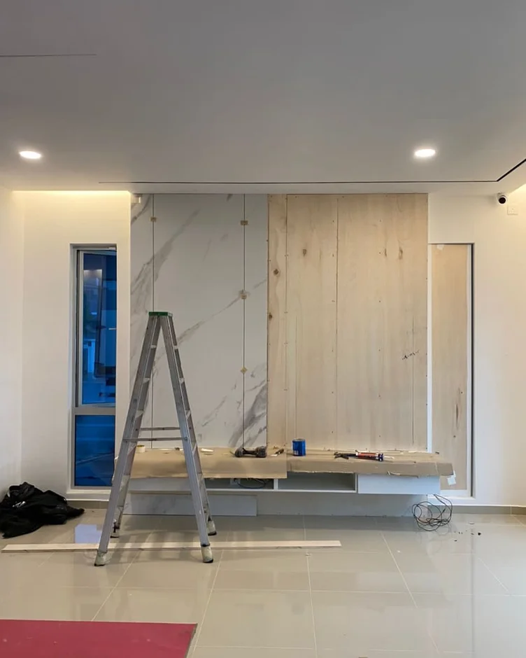 A custom media wall was created using marble-look panels with vertical black accent lines. This design frames the TV area, adds architectural depth, and serves as a focal point in the living room.