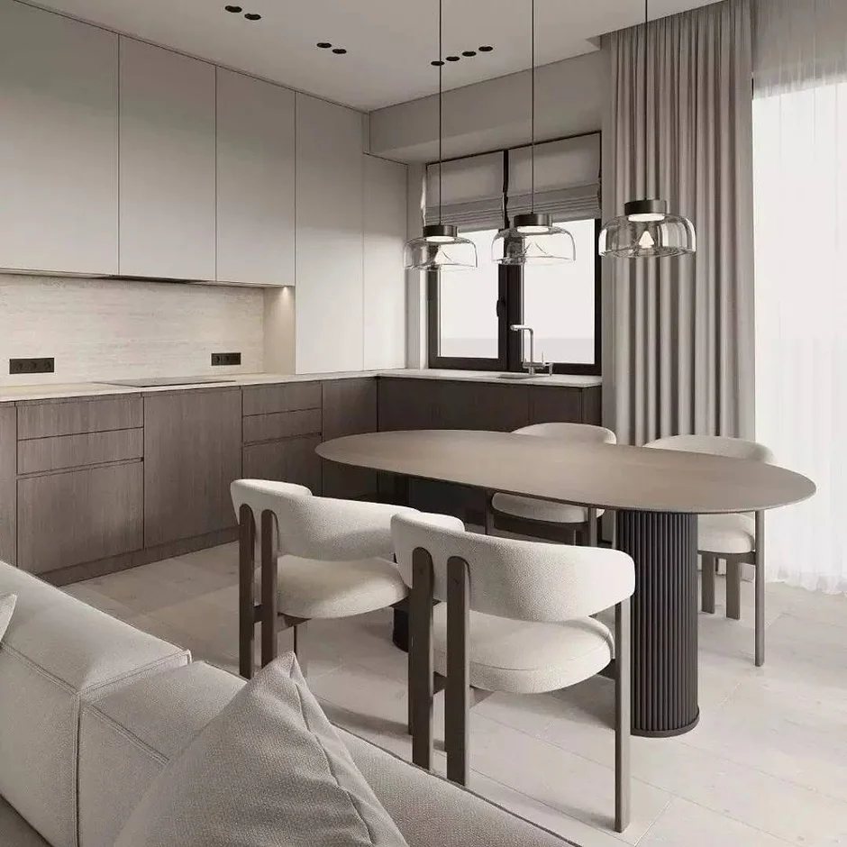 Created a dedicated dining zone with a custom dining table, upholstered chairs, and pendant lighting positioned to define the space without visual separation. -
